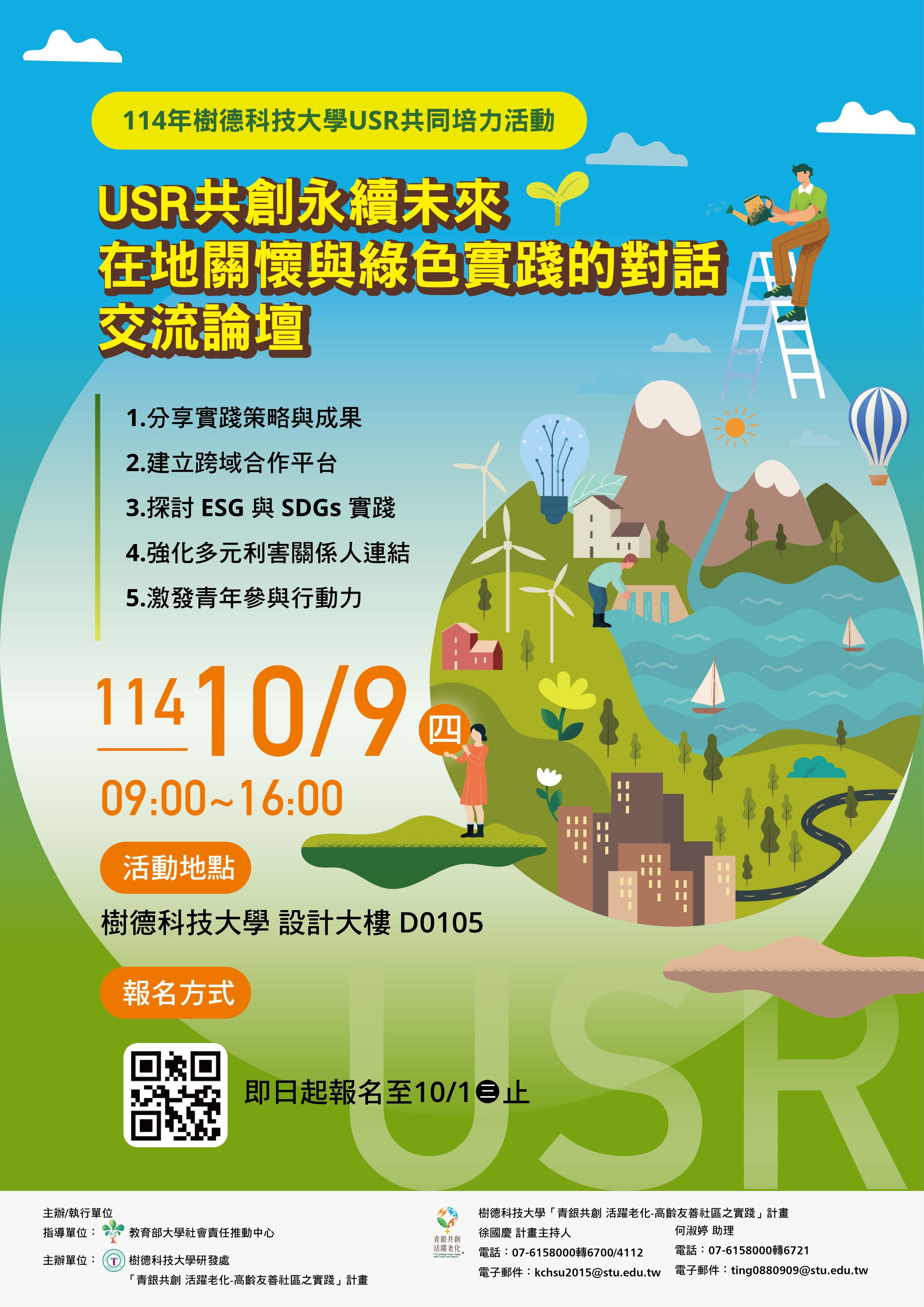 一、面對全球化挑戰與在地議題,大學為知識與實踐場域角色更顯重要。旨揭活動係匯聚本校USR計畫團隊智慧,聚焦高齡友善、電動車永續、水環境保育與文化永續等議題,透過經驗分享與跨域對話,共同推動大學社會責任,促進在地與永續發展。論壇主題場次如下: