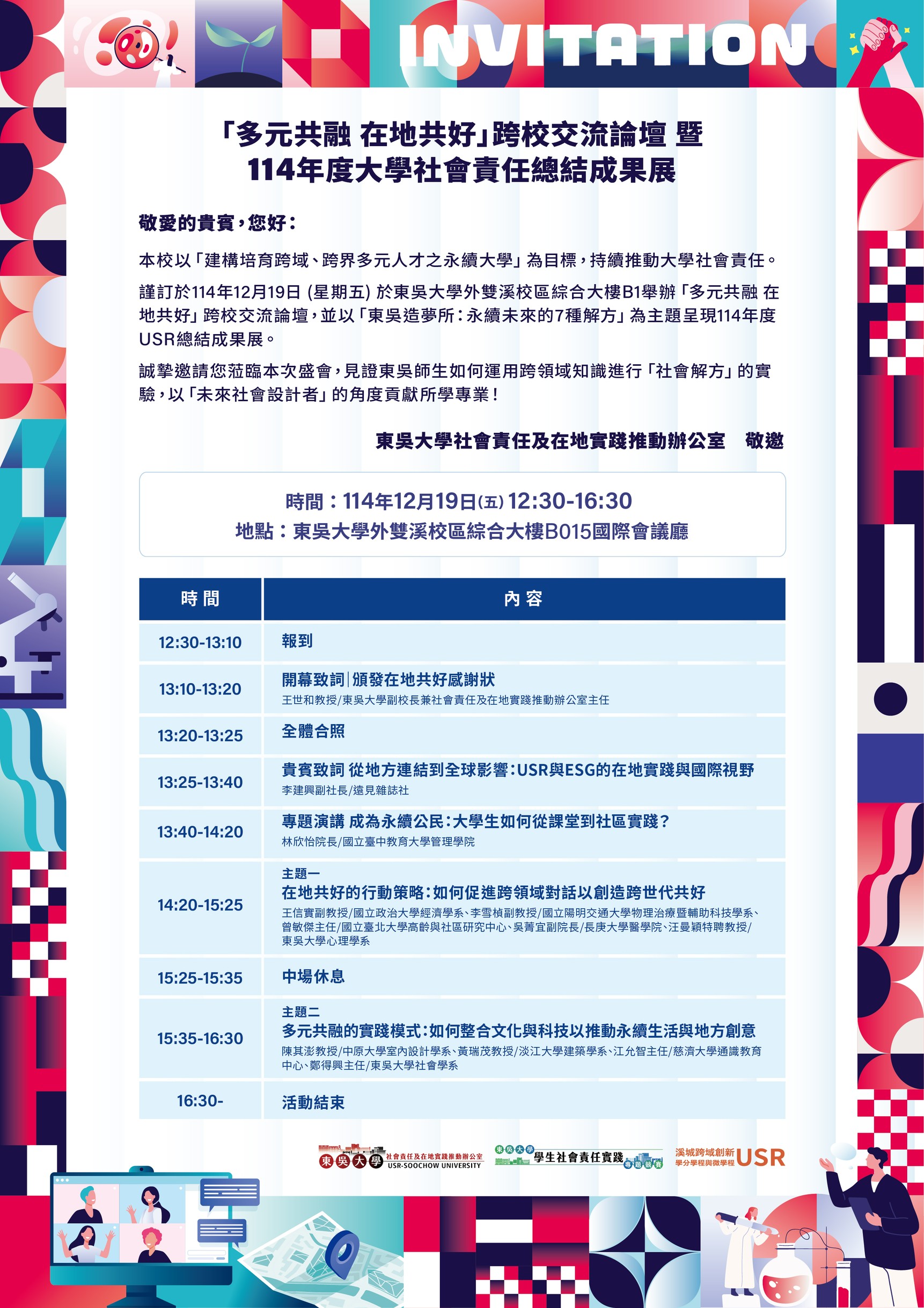 一、本校因執行教育部第四期大學社會責任實踐計畫,以「多 元共融 在地共好」為核心主軸,舉辦跨校交流論壇暨成果 展,敬邀各校USR計畫團隊分享交流,並展現本校114年度 大學社會責任執行成果及實踐效益。